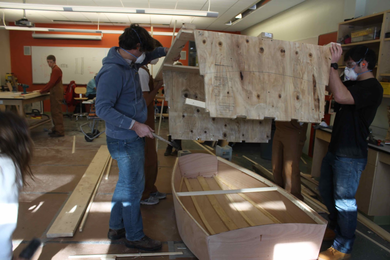 Today, the masts are being painted, as well as the sails being attached. One of the boats is being prepared to go outside and be sanded. It is being vacuumed and cleaned. This boat already has the seat secured in it, as well as the knees in each corner. The other boat is also being cleaned out and vacuumed. We are taking measurements to cut the sides of the boat, so we can place the seat in the side of boat, instead of on top. The knees are being measured and placed into the second boat. Sarah ~